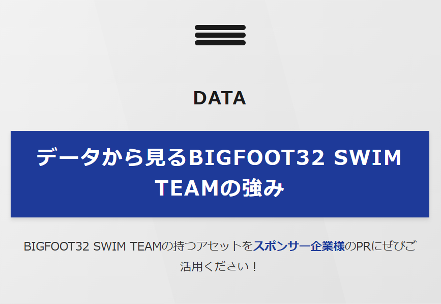 BIGFOOT32 SWIM TEAMでは、当チームの理念などにご理解、ご賛同頂けるオフィシャルスポンサー、サプライヤー企業様を募集しております。