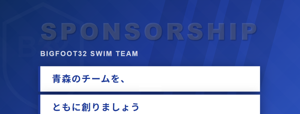 ユニフォームからトレーニング着、水着まで、様々なシーンでBIGFOOT32 SWIM TEAMを支えて頂くスポンサーシップ。貴社の企業イメージをより広く・強くアピールするための最強のツールです。