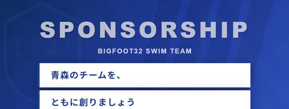 ユニフォームからトレーニング着まで、様々なシーンでBIGFOOT32 SWIM TEAMを支えて頂くスポンサーシップ。貴社の企業イメージをより広く・強くアピールするための最強のツールです。