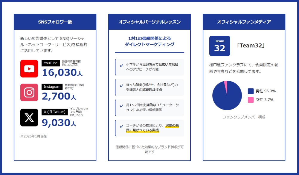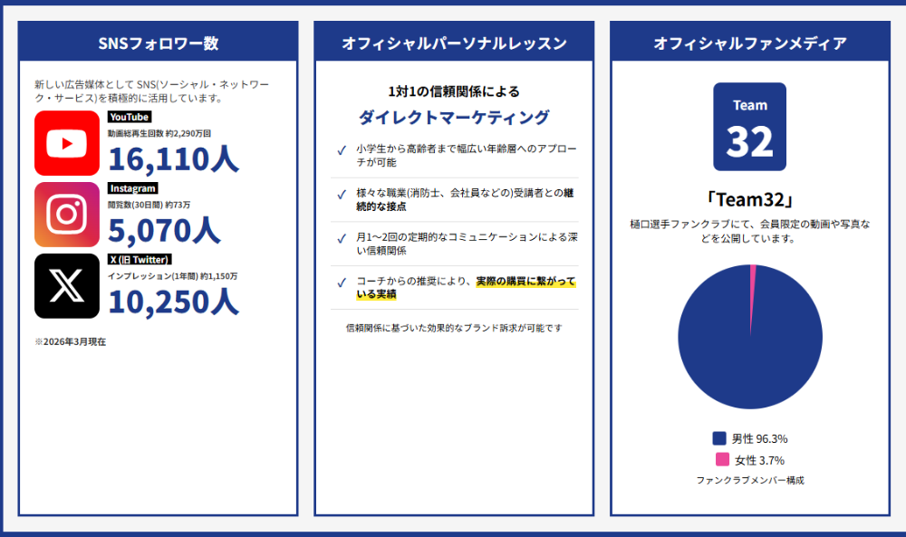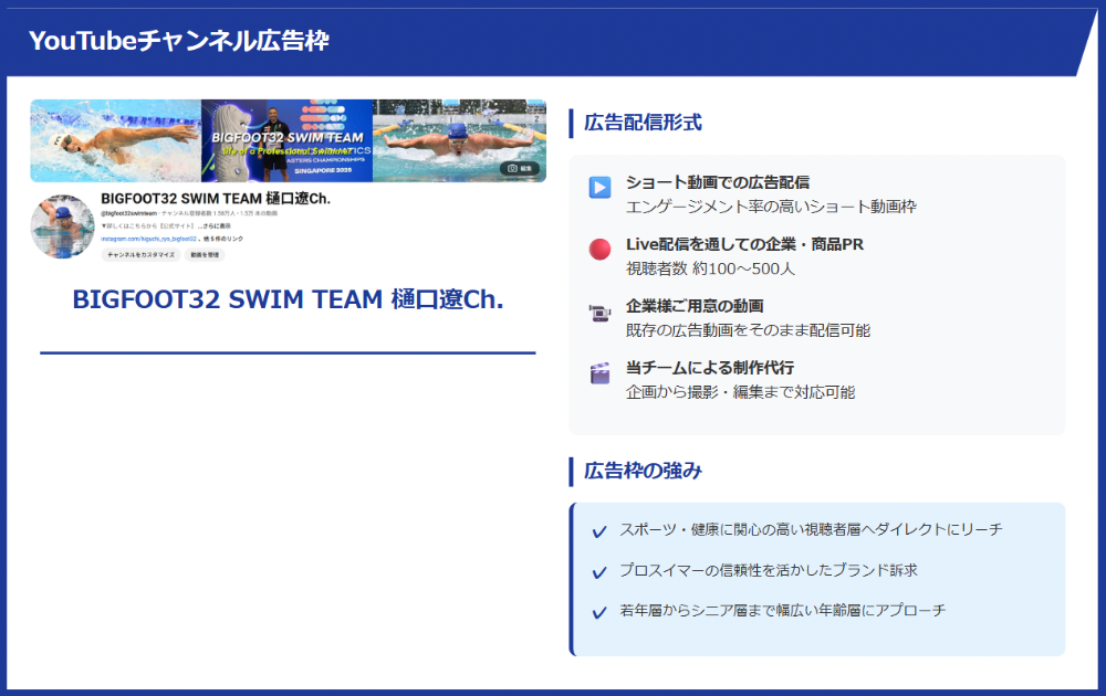 「〇〇(企業名)はBIGFOOT32 SWIM TEAM/樋口遼選手を応援しています」という文言を広告や名刺などに入れ込む事が可能になります。ブランディングや商談時の話題のきっかけとしてご活用頂けます。
